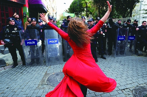 当地时间12月9日,土耳其伊斯坦布尔,当地一栋房屋将被强制改建为会议中心,租户街头抗议,与警方发生冲突。图为一名女子抗议房屋遭强征,在防暴警察面前翩翩起舞。