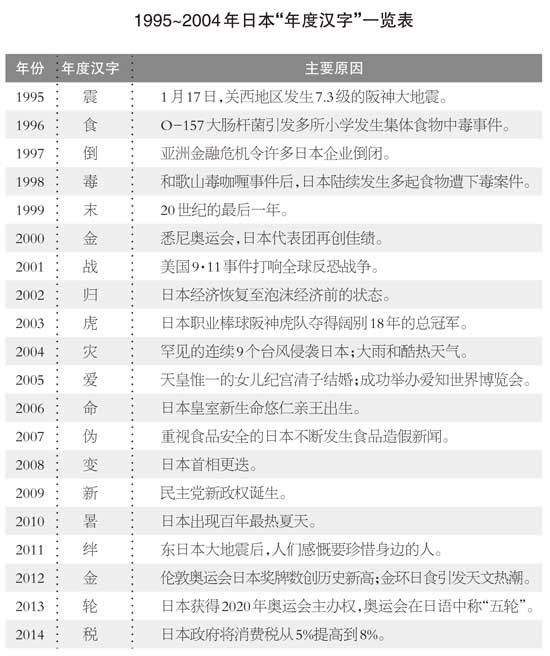 汉字在日本被广泛应用,而“年度汉字”往往具备相当高的概括性,颇能说明问题。自1995年起,每到农历腊月,汉字能力检定协会都会根据公众的投票,选出最能代表过去一年日本社会的汉字。今年已是第20次评选。
