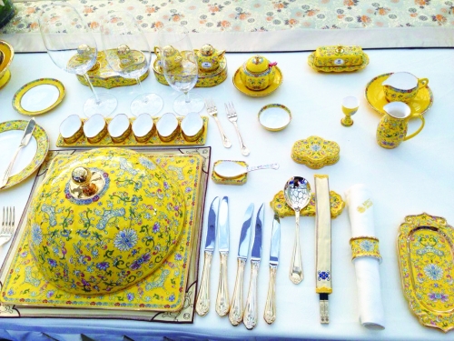 APEC国宴专用餐具的核心元素“如意宝相纹”,源自甘肃敦煌壁画中的纹饰,经过甄选提炼出宝相花纹、牡丹纹、云纹、如意纹等中国传统吉祥图案,贯穿使用在每款产品的设计之中。国宴用瓷的器型设计传承了深厚的中国传统文化,通过造型层层烘托的上升感,形成仪式感。造型特意营造体量感、稳重感,同时保持线型的简约与松弛,庄重中富有现代感。国韵黄和汉白玉两款色调相辅相成,交相辉映。珐琅彩瓷器工艺技法则源自清代康熙年间晚期,代表了中国陶瓷制作的最高水平,被誉为绝版的宫廷艺术珍宝。整套陶瓷餐具在传承古法技艺的基础上,结合现代贴纸工艺创新演绎,既保留了珐琅彩工艺的精致程度,又实现了现代化生产,体现了现代陶瓷工艺发展的趋势。