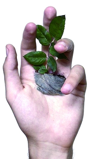 这名艺术家跟自己手掌的表皮较上了劲,他像处理水泡一样,在手掌中心割开了一块几厘米见方的表皮,做成一个小袋,在里面填上土,又把一株玫瑰种了进去。