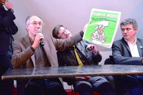 1月13日,《查理周刊》主编布里亚德(左)、头版创作者卢斯(中)和专栏作家佩鲁召开新闻发布会。图片来源 CFP |