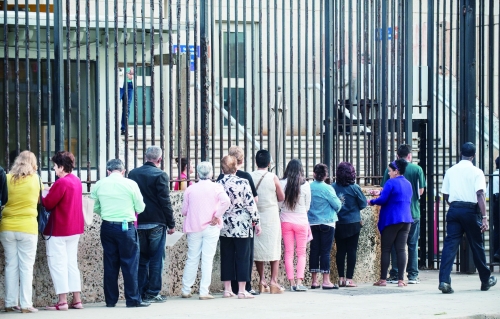 2014年12月22日,古巴民众在美国驻哈瓦那办事处外排队等待申请签证。 图片来源 CFP |