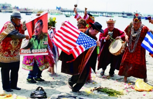 2014年12月29日,秘鲁的萨满巫师举着美国总统奥巴马和古巴主席卡斯特罗的海报,在海边祈祷世界和平以及美古有更好的国家关系。 |
