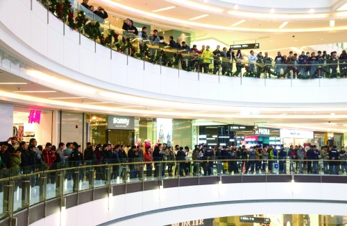 郑州苹果店开业当天,现场异常火爆。顾客排起的队伍挤满三个楼层。图片来源 CFP |