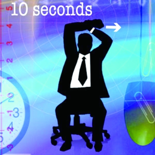 3.体侧伸展 挺直上身坐到椅子上,左臂伸向天花板,右臂同样上伸,右手抓住左手腕,将其向右拉。你会感到左侧身体被拉伸。坚持10秒后,手臂换位,拉伸身体右侧。 |