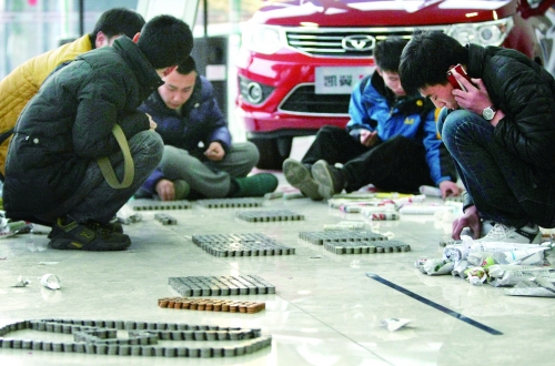 1月21日下午,河北石家庄一家汽车销售店里,两名青年男子带着四个编织袋的一元硬币,共计两万元,前来买车。 |