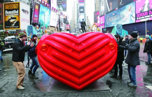 2月9日,美国纽约,情人节将至,时代广场竖起情人节雕塑“情人鼓”。