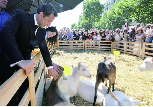 法国前总统萨科齐和妻子卡拉·布吕尼几年前在参观巴黎“自然首都”展时,摸着小羊羔。 |