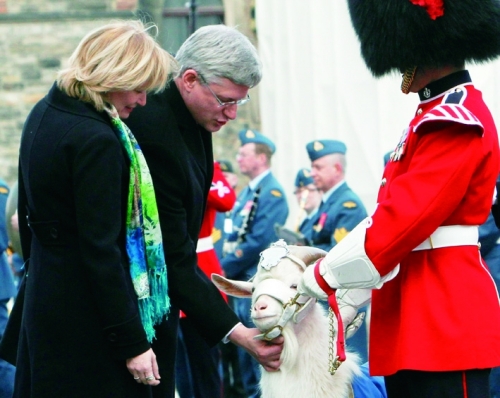 2013年3月13日,加拿大渥太华,加拿大总理哈珀和妻子在议会外等待法国总理埃劳时,“挑逗”总督卫队的吉祥物。 |
