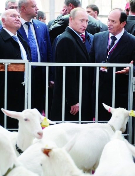 总统普京曾在莫斯科全俄展览中心参观第十届俄罗斯农业展览会,其间与羊邂逅。 |