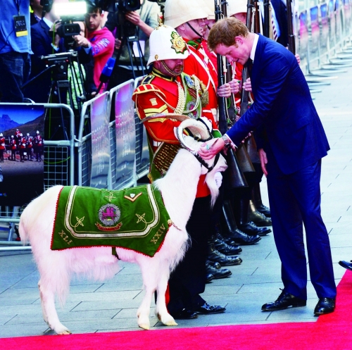 2014年6月10日,英国伦敦,电影《祖鲁战争》上映50周年,哈里王子和各界名流参加。哈里王子对皇家威尔士军团的吉祥物山羊Shenkin饶有兴趣。 |