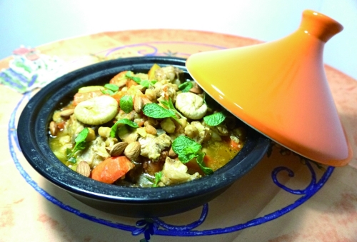 “塔吉锅”(Tajine)是另一道传统的马格里布菜,吃法跟“古斯古斯”相似,但汤汁要少很多。“塔吉锅”要使用特制的锅,一般是陶铸的平底深盘,盖子很高,呈漏斗形倒扣在锅上。把肉、菜、调料、橄榄油放到锅里之后,盖好盖子,上火加热,煮熟后带锅直接上桌。
