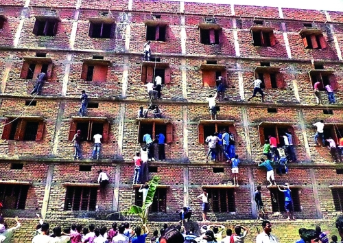 在印度东部的比哈尔邦,为帮孩子作弊,父母爬上高墙“递小抄”。 |