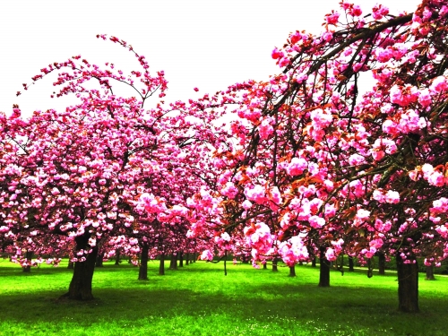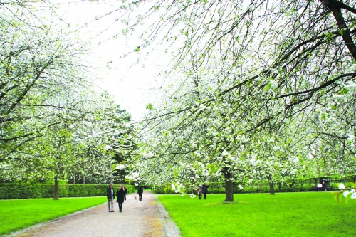 穿过绿色地毯般的“尚特内平原”,就进入了正方形的粉色樱花园。放眼望去,枝丫上处处是如火般热烈锦簇的花团,宛如少女的多层长裙,每一瓣都展露出娇羞撩人的风姿。我愿长久地站立在樱花树下,将她深情凝视,直到她终于凋零的那一天,片片残红的温婉仍可触动我心中最柔软的部分。