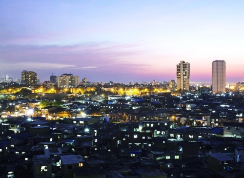 印度孟买,高层住宅屹立在亚洲最大的贫民窟旁。印度阶层流动困难,贫富差距巨大。 |