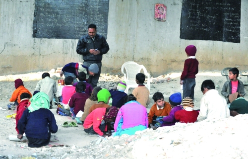 印度新德里一座铁路桥下的免费学校。住在附近贫民窟的40个孩子每天都会来这里上学。印度的种姓制度深深影响着人们的命运。 |