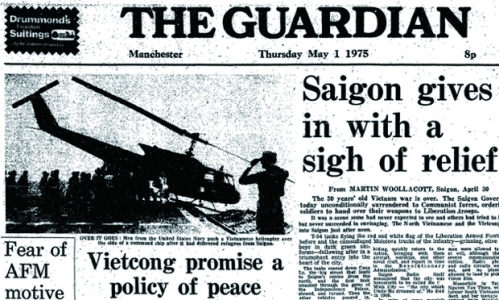 1975年5月1日,越南战争结束后英国《卫报》的头版报道。 |