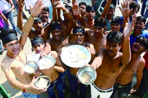 印度阿拉哈巴德,学生拿碗“讨钱”,抗议腐败。 |