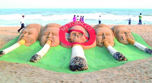 2014年5月30日,印度布巴内斯瓦尔Puri海滩,沙画艺术家Sudarsan Pattnaik在海滩制作有关世界无烟日主题的沙雕。 |