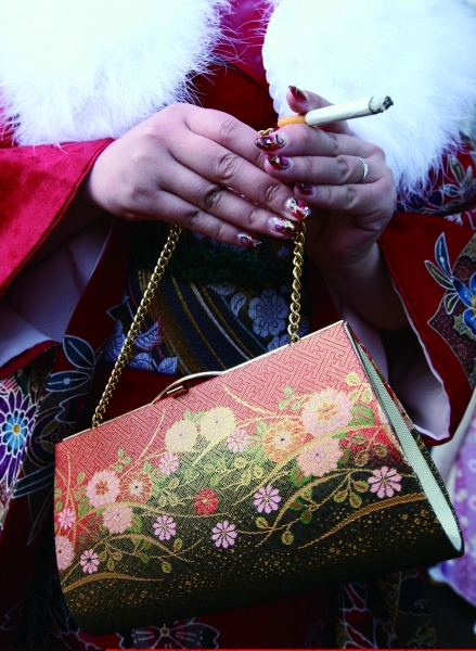 在当今社会,越来越多的女孩开始吸烟,美女加香烟似乎成为一种时尚方式,也有很多男性认为吸烟的女孩更加性感。图为日本女孩在参加成人礼时吸烟。 |