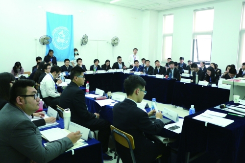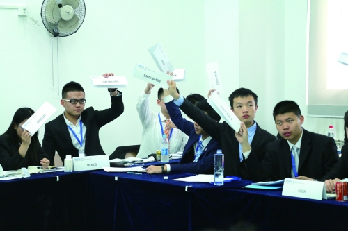 2015北京模拟联合国大会上,代表不同国家立场的代表正在投票。