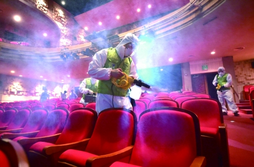 6月16日,工作人员穿着防护服为首尔世宗文化中心消毒。 |