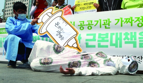 6月16日,在首尔政府办公大楼前,韩国保健医疗产业工会以表演对政府表示抗议,希望通过扩充医疗人力等措施遏制疫情、保护医务人员。 |