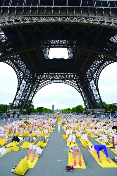 6月21日,法国巴黎,民众在埃菲尔铁塔下做瑜伽。 |
