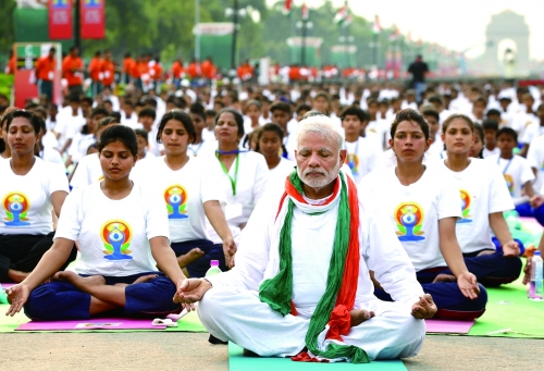 6月21日,上万名印度人带着瑜伽垫涌到首都新德里的著名景点国王大道上,在总理莫迪的带领下练习瑜伽,以庆祝联合国首个“国际瑜伽日”。