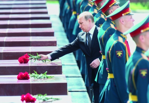 6月22日,俄罗斯莫斯科,为纪念卫国战争爆发74周年,俄总统普京向克里姆林宫旁亚历山大花园内的无名烈士墓献花,俄总理梅德韦杰夫、国防部长绍伊古等人出席了活动。