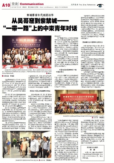 应全国青联邀请,6月21日,由98名社会各界青年组成的“柬埔寨青年代表团”(下简称“百人团”)抵达北京,进行为期5天的交流访问。期间,“百人团”到访了北京、天津两座城市,并于6月25日在中国青年报报社进行了“从吴哥窟到紫禁城——‘一带一路’上的青年对话”主题交流活动。