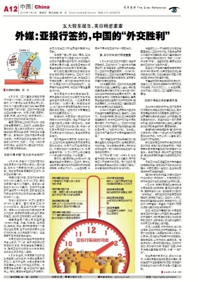 在英国广播公司(BBC)看来,亚投行对中国而言不仅是巨大的外交胜利,也服务于重要的经济目标;正在崛起的大国借此展示力量,但它是否有能力领导全球金融机构的改革仍有待观察。