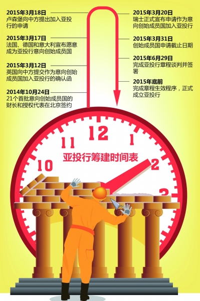 中国财政部部长楼继伟在新闻发布会上表示,下一步,各方将按照此前商定的时间表,积极推进各项筹建工作,确保亚投行如期在2015年年底前正式成立并及早投入运转。