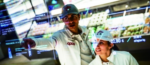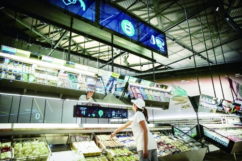 货架上方,阿尔弗莱德骄傲地称为“帆”的成排黑色屏幕横贯了整个货品陈列区。当客人拿起一颗番茄,一系列数据和信息就会出现在屏幕上,详细介绍它的来源地和营养含量,甚至碳足迹。
