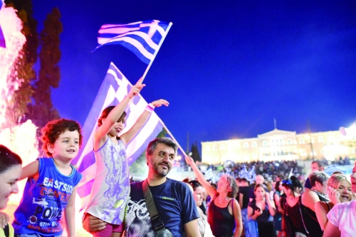 7月5日晚,成千上万的希腊人挥舞着国旗在雅典宪法广场上载歌载舞,兴奋地高呼“不”。他们在等待公投结果正式公布。