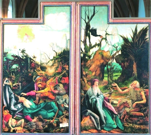 中世纪晚期的艺术家纷纷沉迷于基督教隐士圣安东尼受魔鬼诱惑的故事。在格吕内瓦尔德看来,最令人恐惧的是心智受到威胁,而魔鬼能造就畸形的思想。这是一幅富有同情心的作品,专为医院创作,以帮助治疗病人。