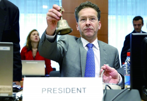 欧元集团主席戴塞尔布卢姆以铃声示意欧元区峰会会议开始。7月13日,经过整夜谈判后欧元区领导人与希腊达成了新的债务协议。图片来源CFP |