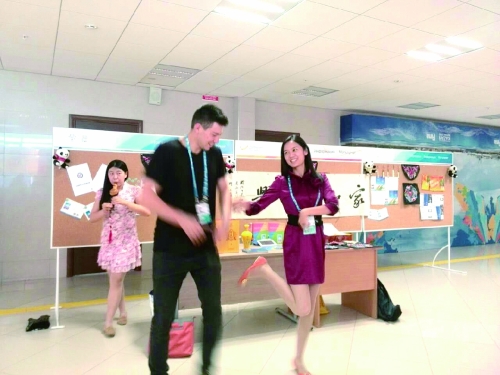 为了充分展现中国的特色,代表团成员荆鸣和我在展台前表演了中国的葫芦丝演奏。一位20岁的俄罗斯男生来到我们的展台前,询问是否能够教他跳中国舞。中国代表团里唯一具有专业水准的杜娟老师为了不让国际友人失望,临危受命,伴着葫芦丝的音乐,教这个身高一米九的俄罗斯男青年跳起了傣族舞。