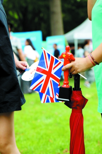 参加开放日活动的民众手持带有中英两国标识的旗帜和纪念品 ▋张 荣摄
