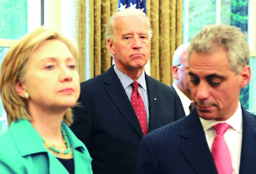 2009年5月28日,美国总统奥巴马在白宫会见巴勒斯坦总统马哈茂德·阿巴斯时,希拉里(左)与拜登(中)同在现场。 |
