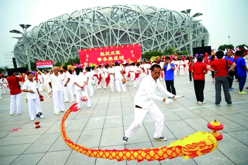 北京民众在“鸟巢”前庆祝北京携手张家口成功申办2022年冬奥会。 |
