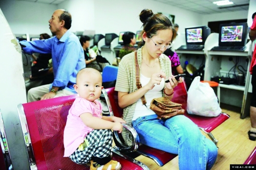 调查发现,中国股民越来越年轻化,部分“90后”挪用自己的生活费、学费入市,还有不少家长也开始支持子女的炒股梦。图为山东青岛证券交易所大厅内,年轻妈妈带着宝宝来炒股。 |