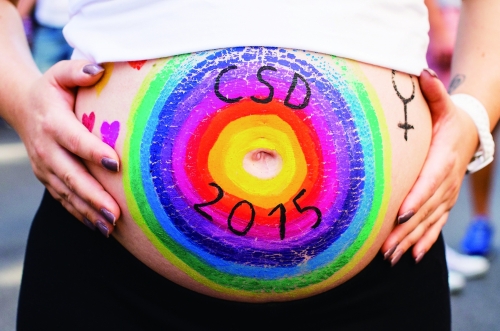 8月1日,德国汉堡,“同性恋者骄傲游行”正在进行,一名孕妇在肚子上画上彩虹标志,表示对同性恋者的支持。