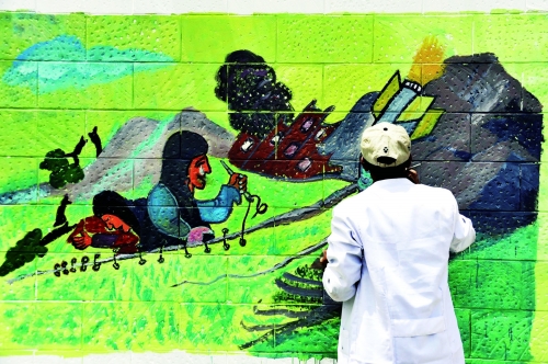 8月2日,也门萨那,艺术家在沙特阿拉伯大使馆外墙涂鸦,抗议沙特空袭。
