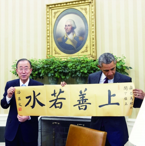 8月4日,美国华盛顿,美国总统奥巴马在白宫会见联合国秘书长潘基文。时逢奥巴马54岁生日,潘基文将亲自撰写书法作品赠给他。