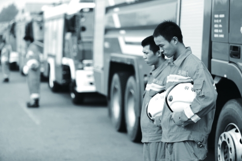 8月16日,天津消防战士为特大火灾爆炸事故遇难者默哀。 |