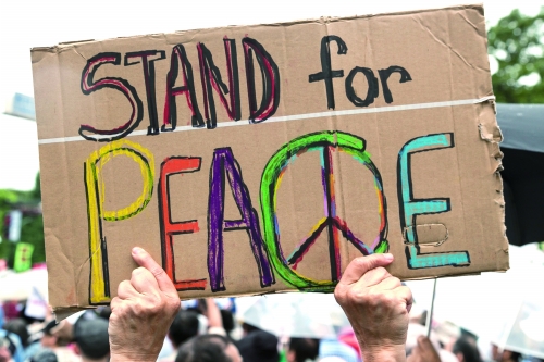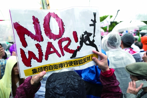 抗议人群高举“安倍下台”、“期待和平”和“反对战争”的标语。 |