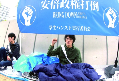 8月28日,日本大学生在国会议事堂前绝食,抗议安倍政府的新安保法案。 |