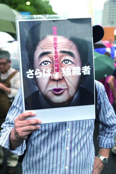 抗议民众将坚持推行新安保法案的安倍形容为“独裁者”。 |
