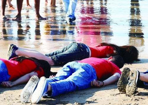 9月7日,摩洛哥民众在拉巴特的沙滩上模仿尸体,以悼念溺亡的叙利亚儿童阿兰。 |